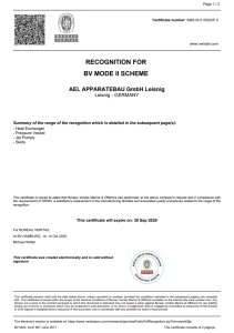 PublikationenBroschüreAEL FirmenbroschüreZertifikate DIN ISO 9001:2015, 14001:2015, 45001:2018(pdf, 190 KB) ASME U Stamp(pdf, 164 KB) National Board (NB/R Stamp)(pdf, 648 KB) Manufacturing Licence China(pdf, 482 KB) DNV(pdf, 481 KB) Bureau Veritas(png, 151 KB) HTRI Membership(pdf, 193 KB) ATEX(pdf, 4 MB) PED 2014/68/EU - A2(pdf, 419 KB) AD 2000-Merkblatt HP 0 / HP 100 R, EN 13445-4, EN 13480-4(pdf, 227 KB) Fachbetrieb nach WHG(pdf, 354 KB) National Board(pdf, 1 MB) EN ISO 3834-2(pdf, 252 KB)